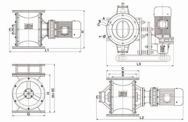 | 型号 | A | B | C | H | Q | L1 (内) | L2 (外) | L3 (链) | n-Ф | 工作温度 ℃ | 转速 转/分 | 电机功率KW |